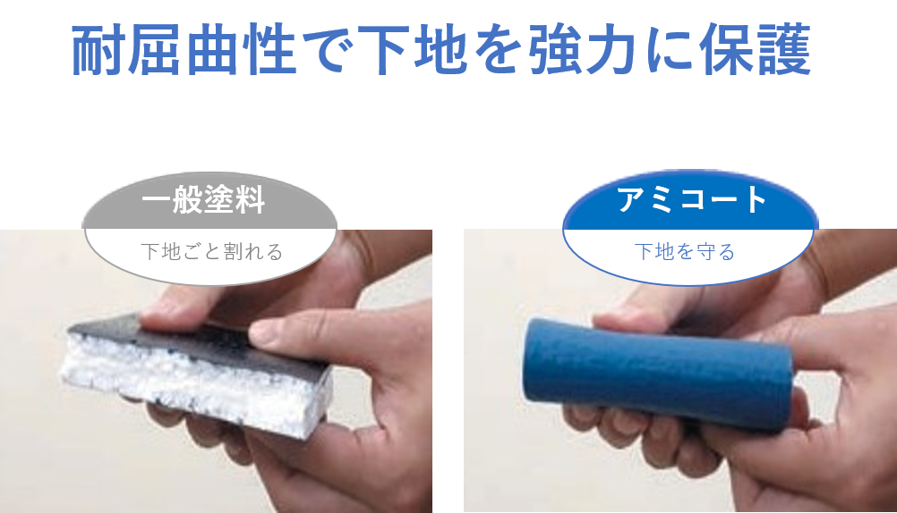 シーリングは建物を水から守る上でとても重要な役割を果たしますが、一般的な高耐久性塗料は塗膜が硬く、割れやすいためシーリングの上に塗装することが困難です。アミコートは高耐久でありながら、特殊繊維により塗膜が割れにくいため、シーリングの上にも塗装でき、長期間にわたり建物の防水性を維持できます。