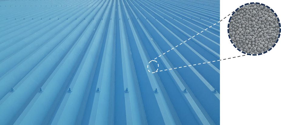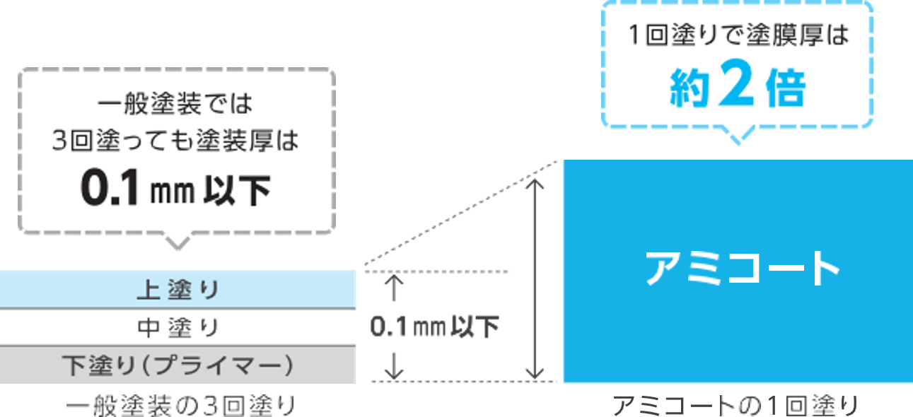 アミコートは塗膜体積の約50%を耐久性に優れた無機成分(シラスバルーン)で構成しています。また塗膜厚も一般塗料の約2倍の厚みとなるため、雨・風・紫外線から建物を長期に渡りしっかり守ります。