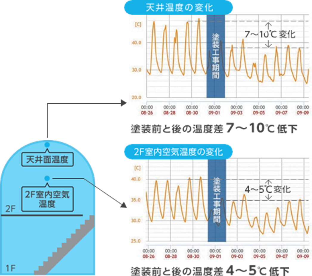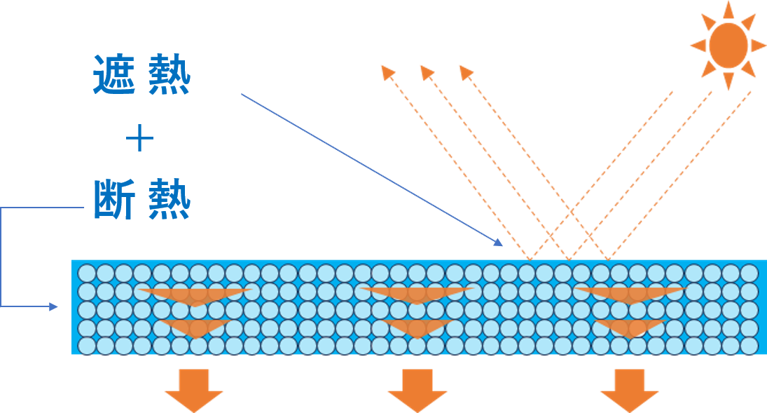 アミコートの遮熱機能は、遮熱調色により日射を高反射する「遮熱」と、中空ビーズ(シラスバルーン)による塗膜内で熱移動を抑制する「断熱」のハイブリッドメカニズム。ダブルの効果でより高い遮熱性能を実現します。