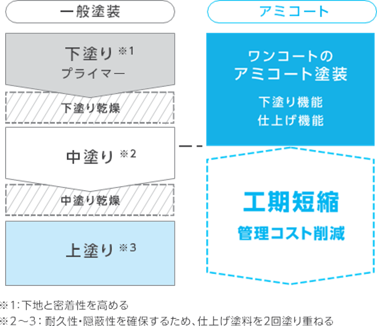 アミコートは塗膜に必要な「密着性」と「耐久性」を兼ね備えた塗料です。そのため素早い工事が可能となり、工期短縮に寄与します。アミコートは標準1回塗りのため、ベランダ窓の養生期間の大幅短縮。マンション共有部分の塗装時間短縮等、生活への負担を最大限抑えた塗装工事が可能となります。