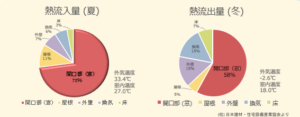 夏冬ともに建物に対する熱の流入、流出に大きくかかわっているのは開口部 (窓)であり、夏は73%冬は58%が窓ガラスからの熱が移動している。