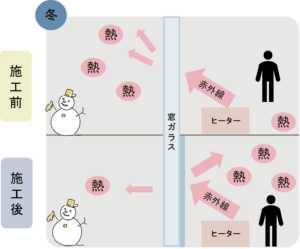 本コーテイングは赤外線を吸収し窓ガラスからの赤外線(熱)の流入、流出を抑えることで遮熱効果を発揮します。